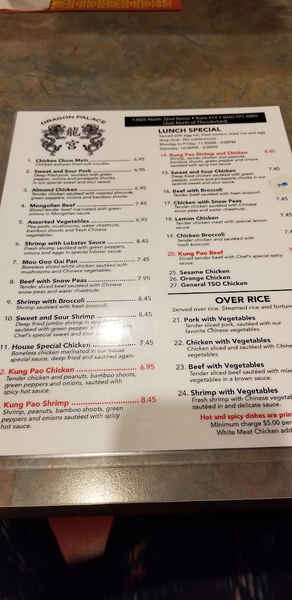 Welcome to Dragon Palace, a cherished gem situated at 13825 N 32nd St, Phoenix, AZ 85032, where authenticity and flavor come together in a vibrant atmosphere. Known for its exceptional Chinese cuisine, Dragon Palace has been delighting diners for decades with dishes that bring together the best of traditional Chinese cooking.